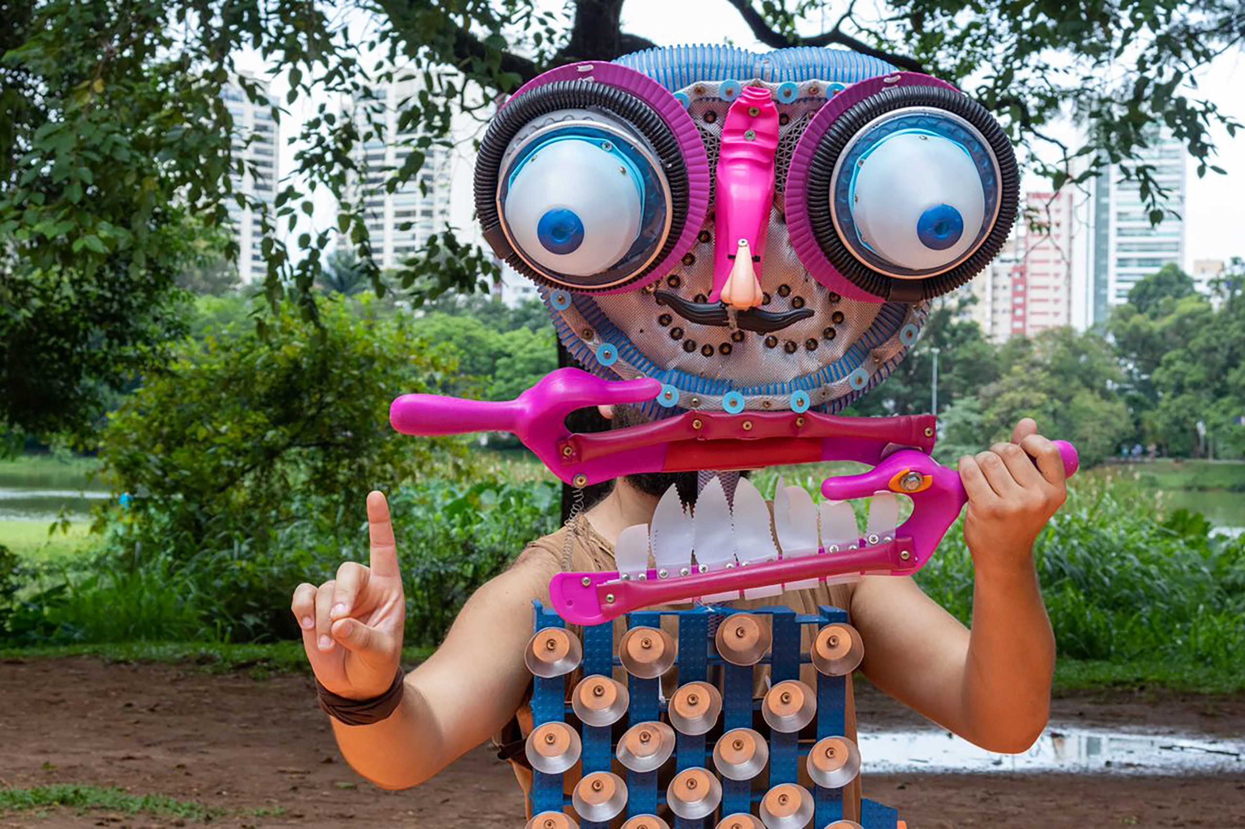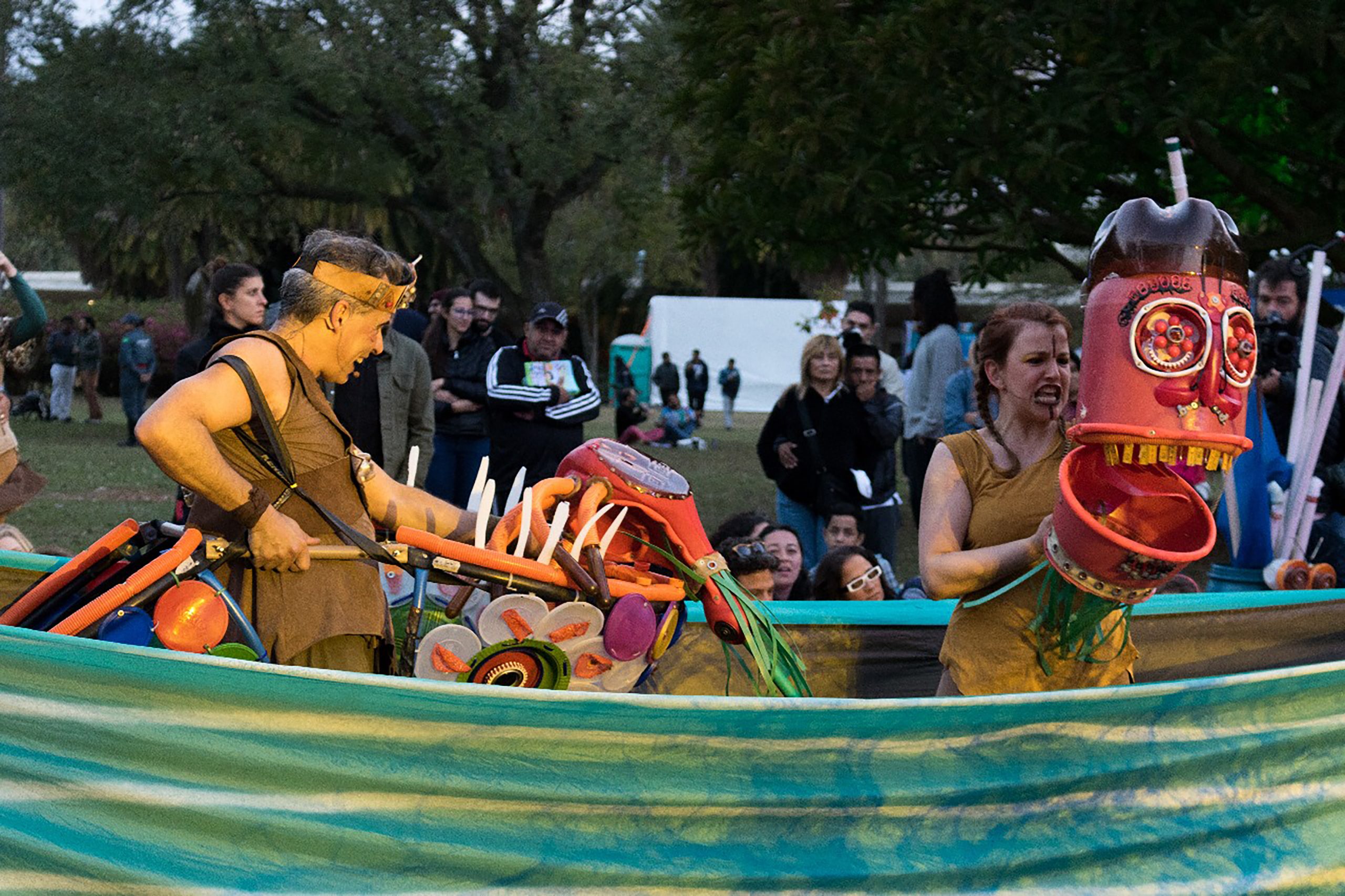 Os bonecos, que representam figuras da cultura popular brasileira como Iara, a Mãe do Rio, Cabeça de Cuia; Jaguarão; Pirarucu e Cobra Grande foram confeccionados pelo artista plástico Adriano Castelo Branco a partir de materiais reutilizáveis.