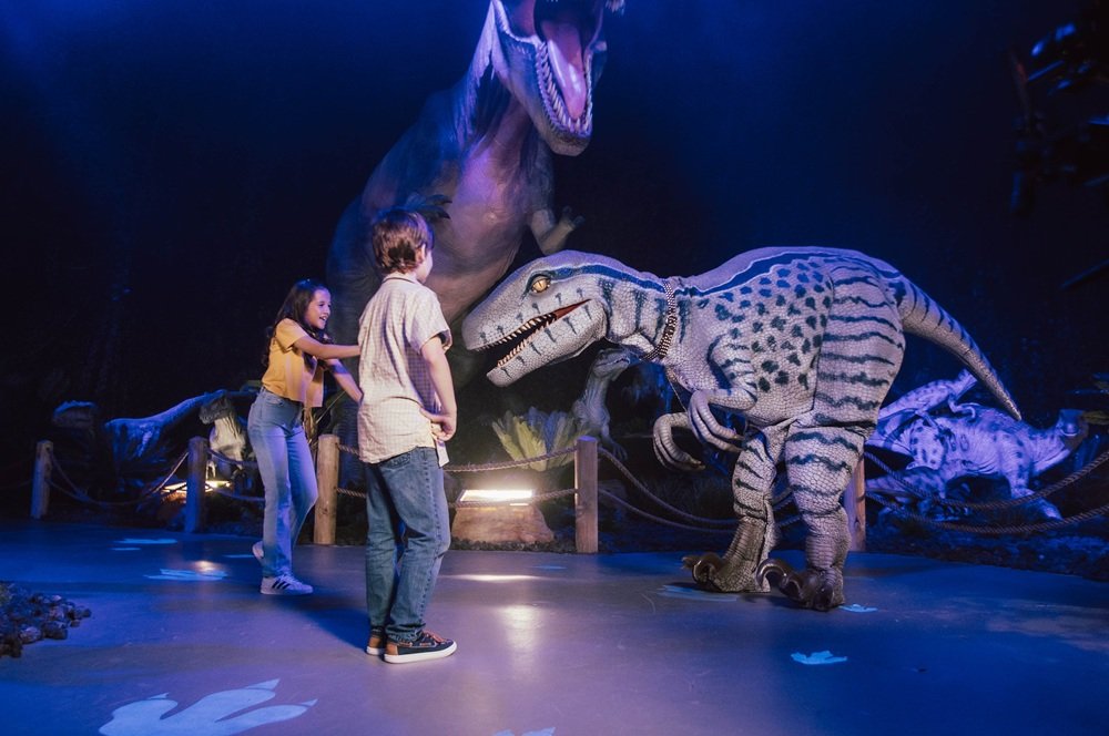 A mostra reúne mais de 40 réplicas animadas em tamanho real, recriando o universo dos dinossauros em uma experiência sensorial e educativa voltada a todas as idades.
