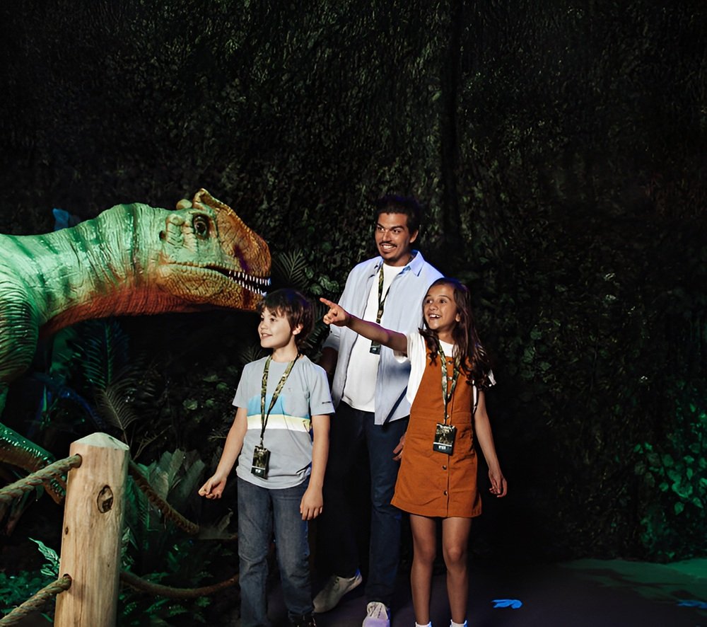 Além das réplicas, o espaço conta com um aquário virtual, que simula os mares pré-históricos e apresenta criaturas marinhas da era dos dinossauros, ampliando a experiência para além do ambiente terrestre. Para o público infantil, há ainda uma área interativa, onde as crianças assumem o papel de jovens paleontólogos e exploradores, com atividades educativas e lúdicas.