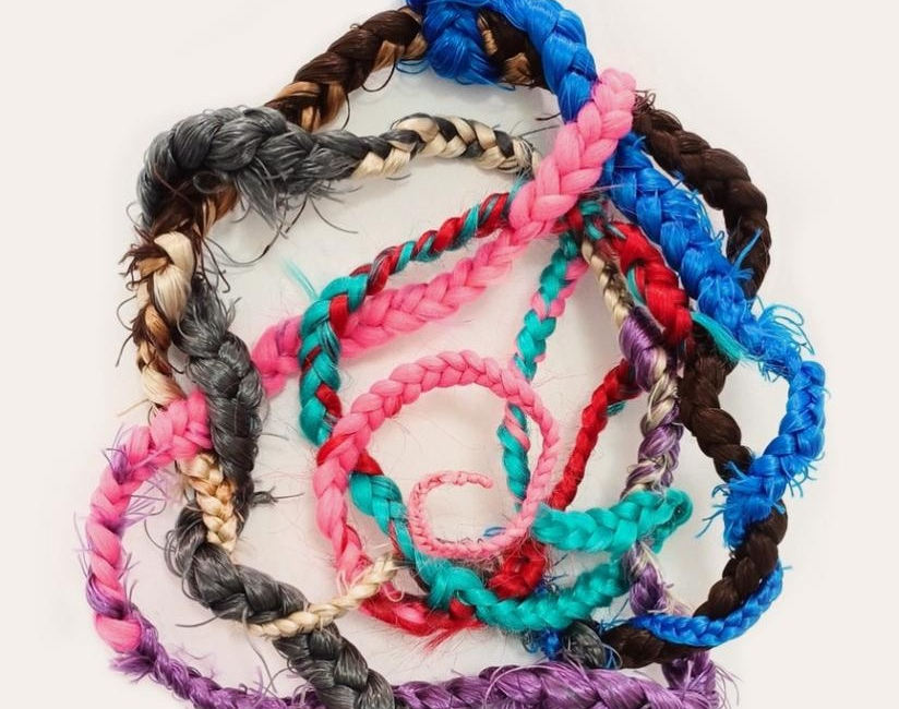 Desenvolvida a partir de sua atuação como trancista no Salão Afro Preta Brasileira, a pesquisa de Suelen nasce do gesto cotidiano de trançar cabelos. Entre fios sintéticos, óleo sobre tela e esculturas trançadas, a artista constrói uma narrativa visual que questiona o apagamento histórico das profissionais trancistas e reposiciona o trançado no campo das artes visuais contemporâneas.
