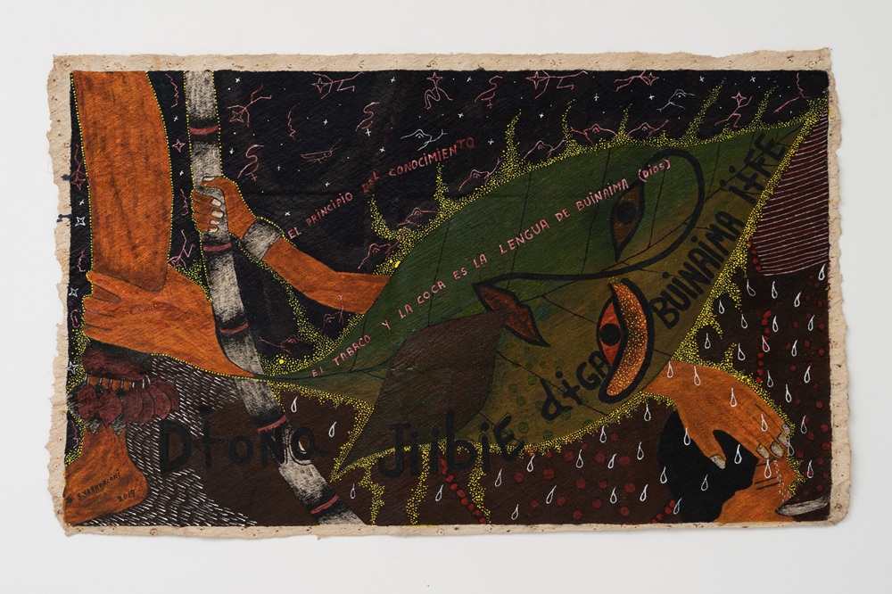 A exposição propõe uma imersão nos saberes, mitos e traumas desse povo indígena, organizando-se em cinco núcleos: Pintura de Sons, Tempo do Choro de Sangue, Mundos Espirituais, Plantas Sagradas e Guardiões da Amazônia. Entre os destaques está a obra “El Principio del Conocimiento (2019), que inspira o título da mostra e representa o mito de criação associado às plantas sagradas coca e tabaco, elementos centrais na transmissão de conhecimento espiritual.
