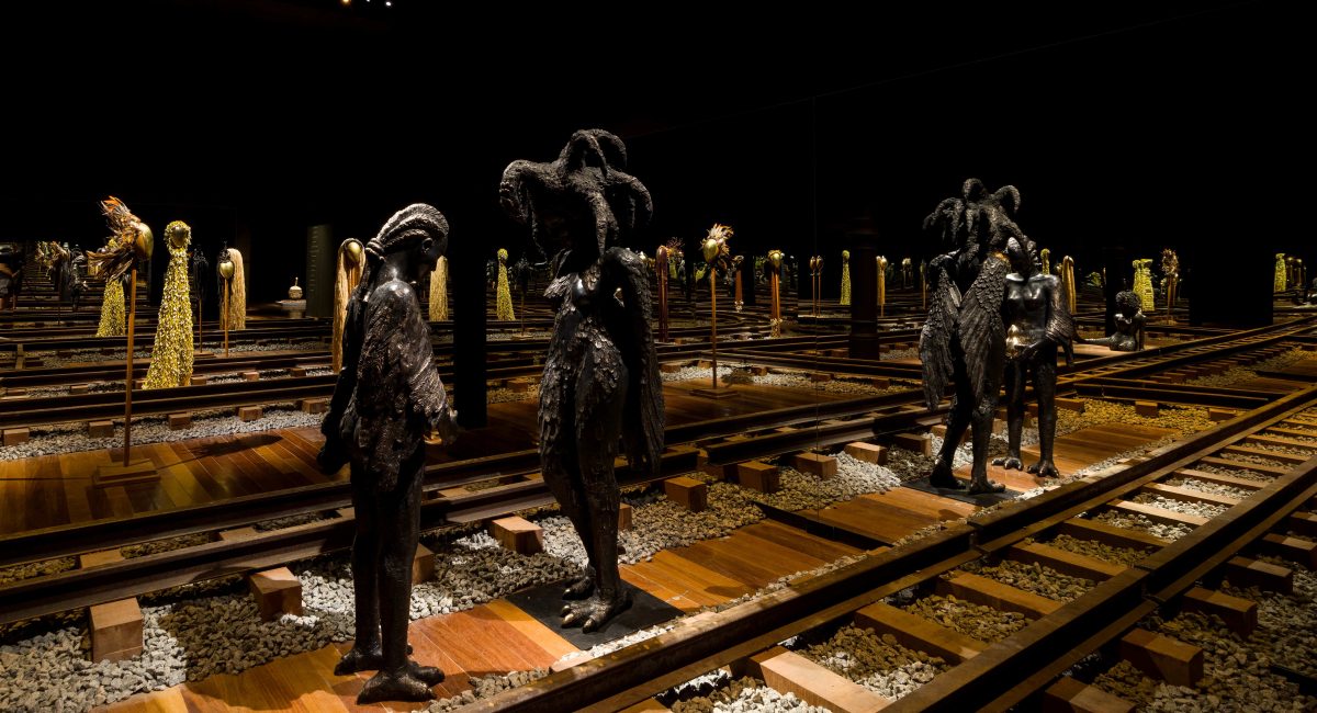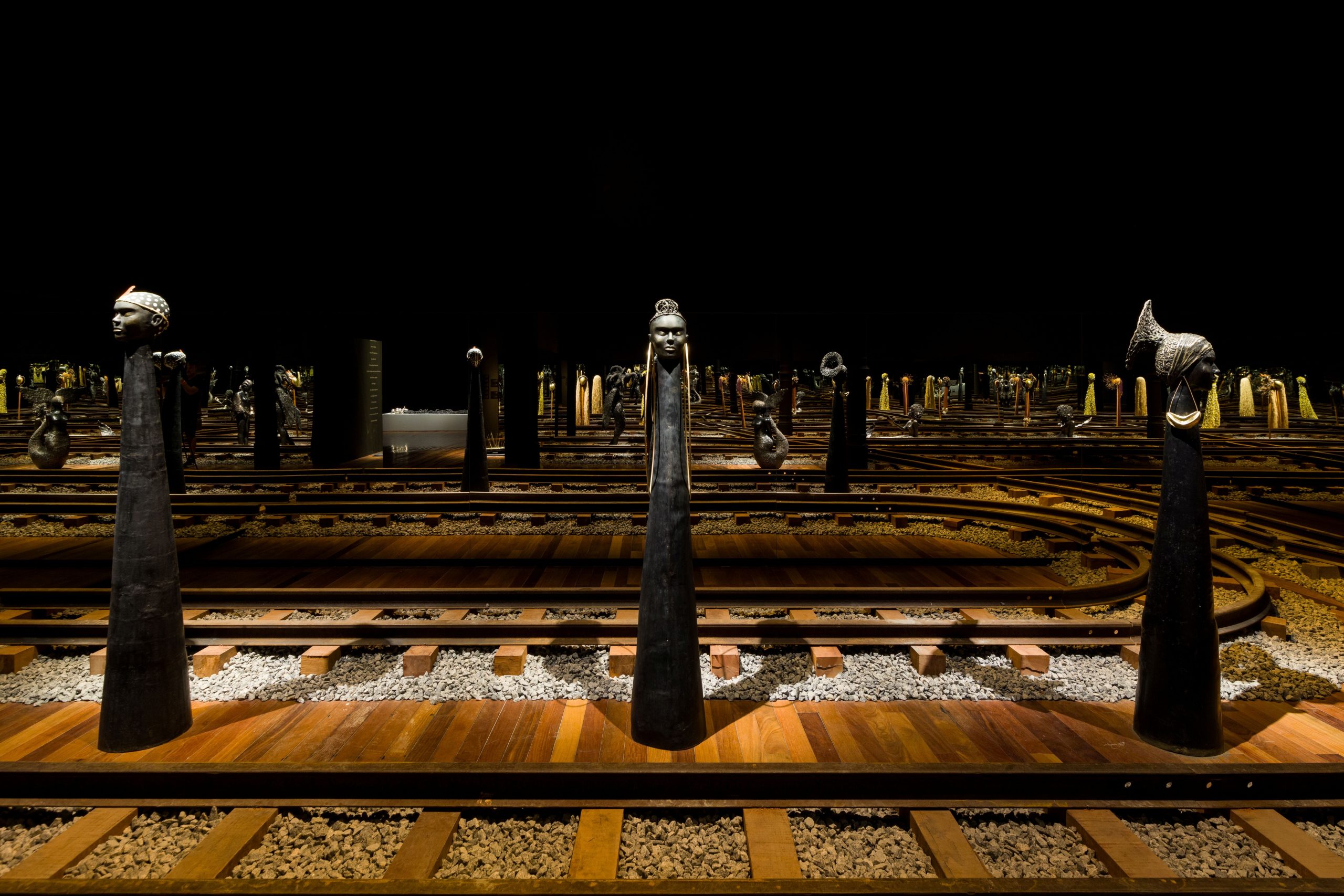 A mostra em São Paulo mantém o conjunto apresentado nas versões anteriores, reafirmando a centralidade das forças femininas na cosmologia afro-brasileira. A montagem foi pensada para intensificar a experiência do público, conduzindo-o por uma travessia simbólica que entrelaça criação, tempo e as energias que conectam o visível e o invisível, como trilhos que se desdobram em múltiplos percursos, abrindo caminhos de ferro entre mundos materiais e espirituais.