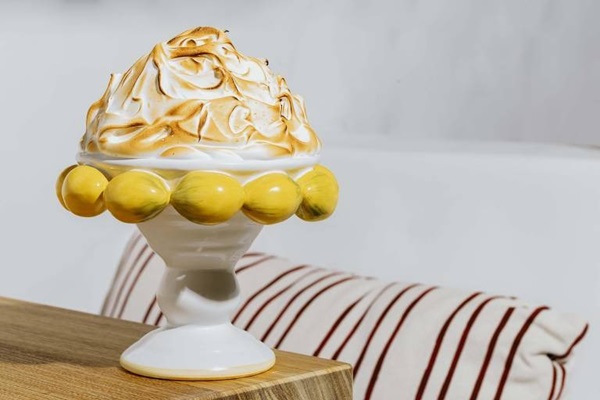 A proposta se estende às sobremesas, caso da torta al limone, de visual escultural e tamanho generoso, pensada para dividir à mesa e encerrar a refeição com o mesmo impacto visual que marca a decoração do restaurante.
