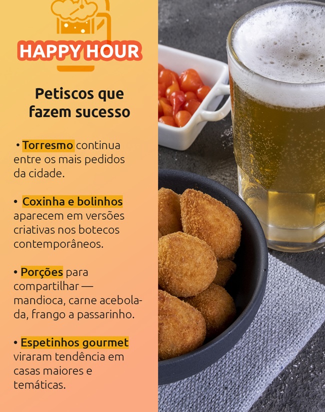 Para acompanhar o chope bem gelado, entram em cena clássicos como frango a passarinho, porções de carne acebolada e petiscos robustos.