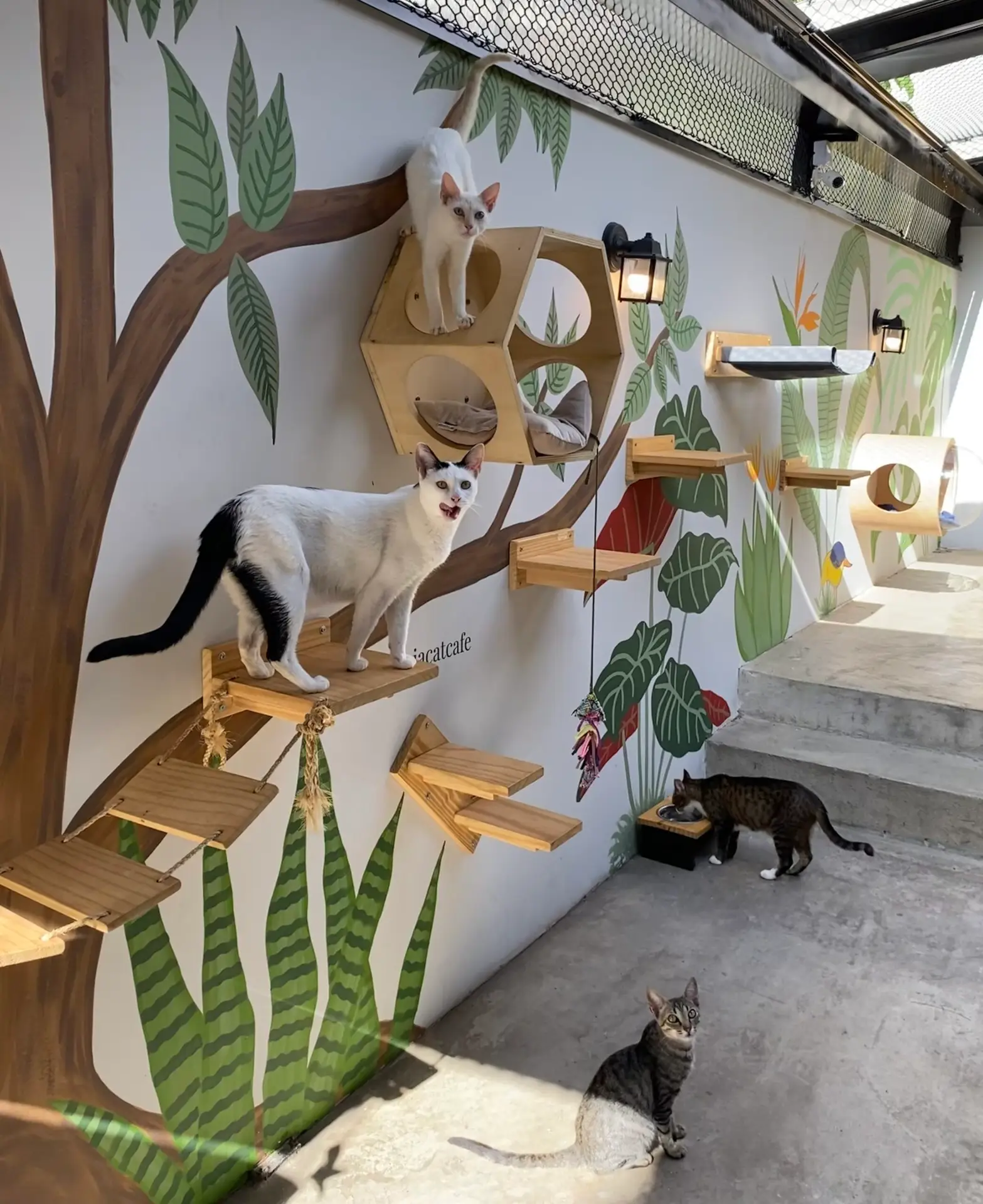 Os felinos vivem em uma área separada e equipada com brinquedos, arranhadores e espaços de descanso, garantindo o bem-estar dos animais. É possível interagir com os gatos durante sessões de convivência e, em muitos casos, adotá-los, promovendo a adoção responsável.