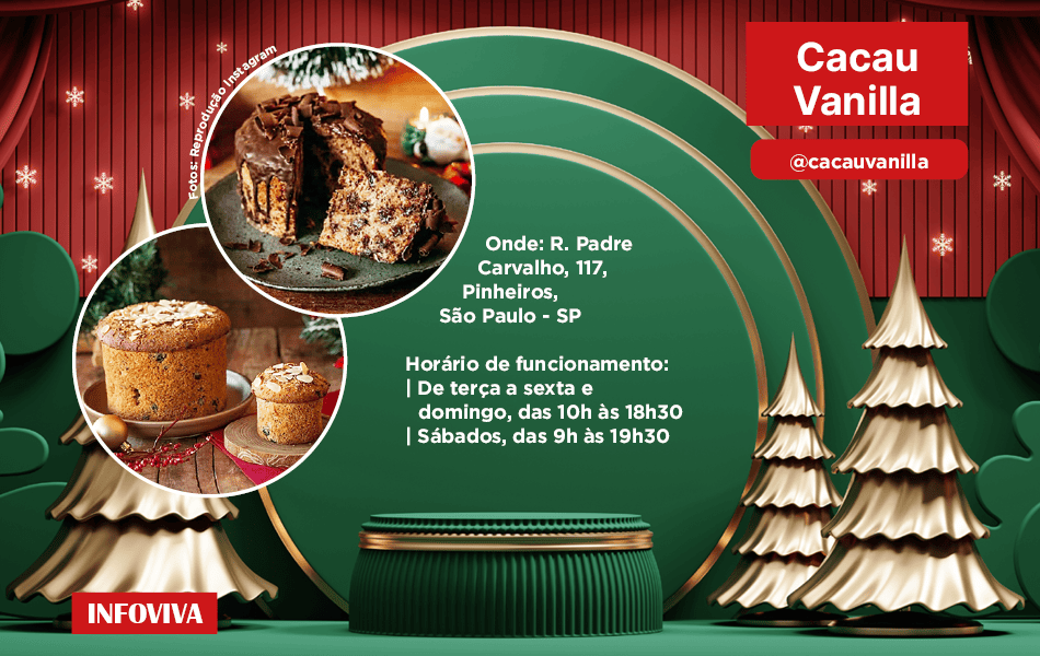 A Cacau Vanilla apresenta uma linha natalina de panetones e chocotones pensada para quem busca sabor sem abrir mão da saúde e da consciência alimentar. Todas as opções são veganas, sem glúten e sem lactose, perfeitas para quem possui restrições alimentares ou deseja uma alimentação mais leve. Entre os destaques estão o Panetone de Frutas Zero Açúcar, adoçado naturalmente e aromatizado com laranja da Bahia, e os Bites, versões menores e práticas, ideais para um lanche rápido ou para presentear. Também há chocotones com cobertura de chocolate vegano e recheios elaborados, mantendo a massa macia e saborosa. Os produtos vêm em diferentes tamanhos, de latas compactas a unidades maiores, e podem ser encomendados pelo site com entrega conforme a região.