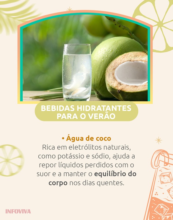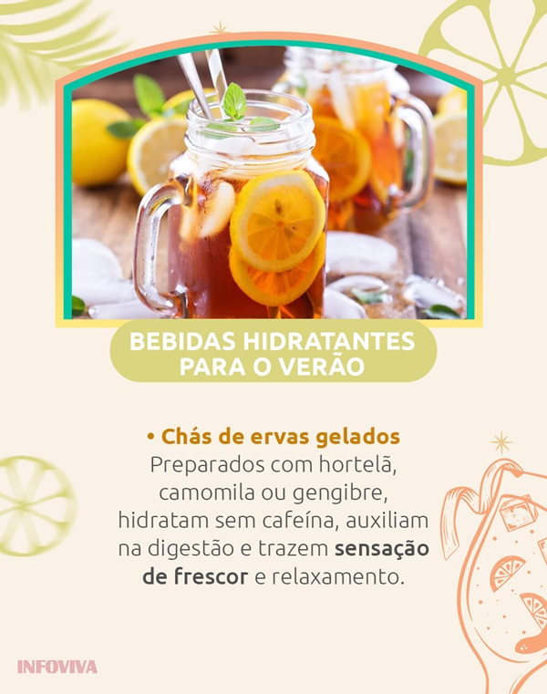 Sucos de frutas frescas oferecem vitaminas e antioxidantes; chás gelados contribuem para refrescar e estimular a digestão; smoothies combinam fibras e energia; águas saborizadas incentivam o consumo de líquidos ao longo do dia; e a água de coco se destaca pela reposição natural de eletrólitos.