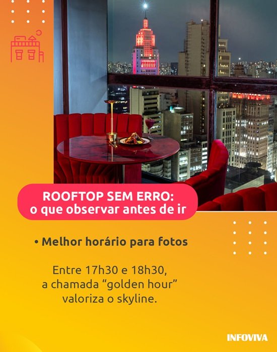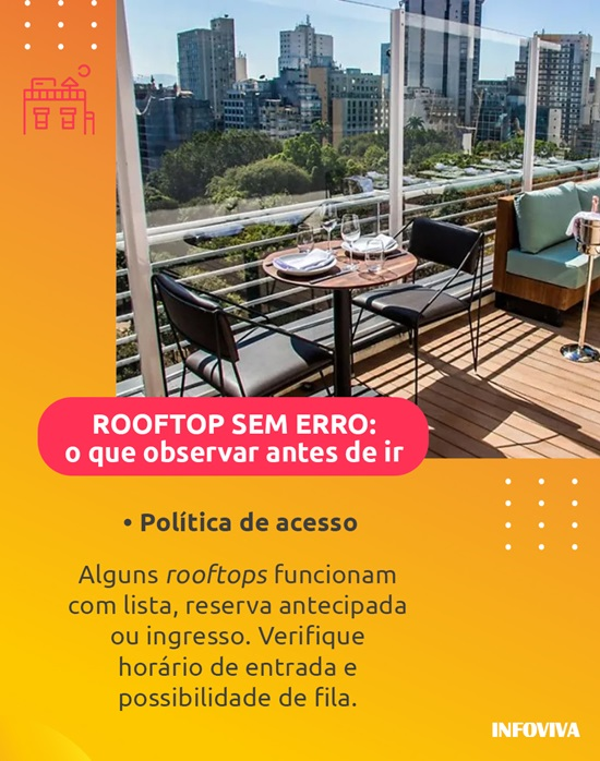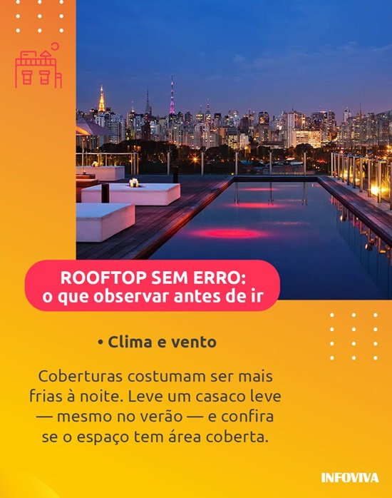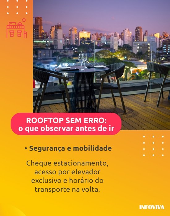- Para impressionar em um encontro: verifique o ticket médio e a carta de coquetéis. Rooftops mais sofisticados investem em autoralidade e apresentação.
