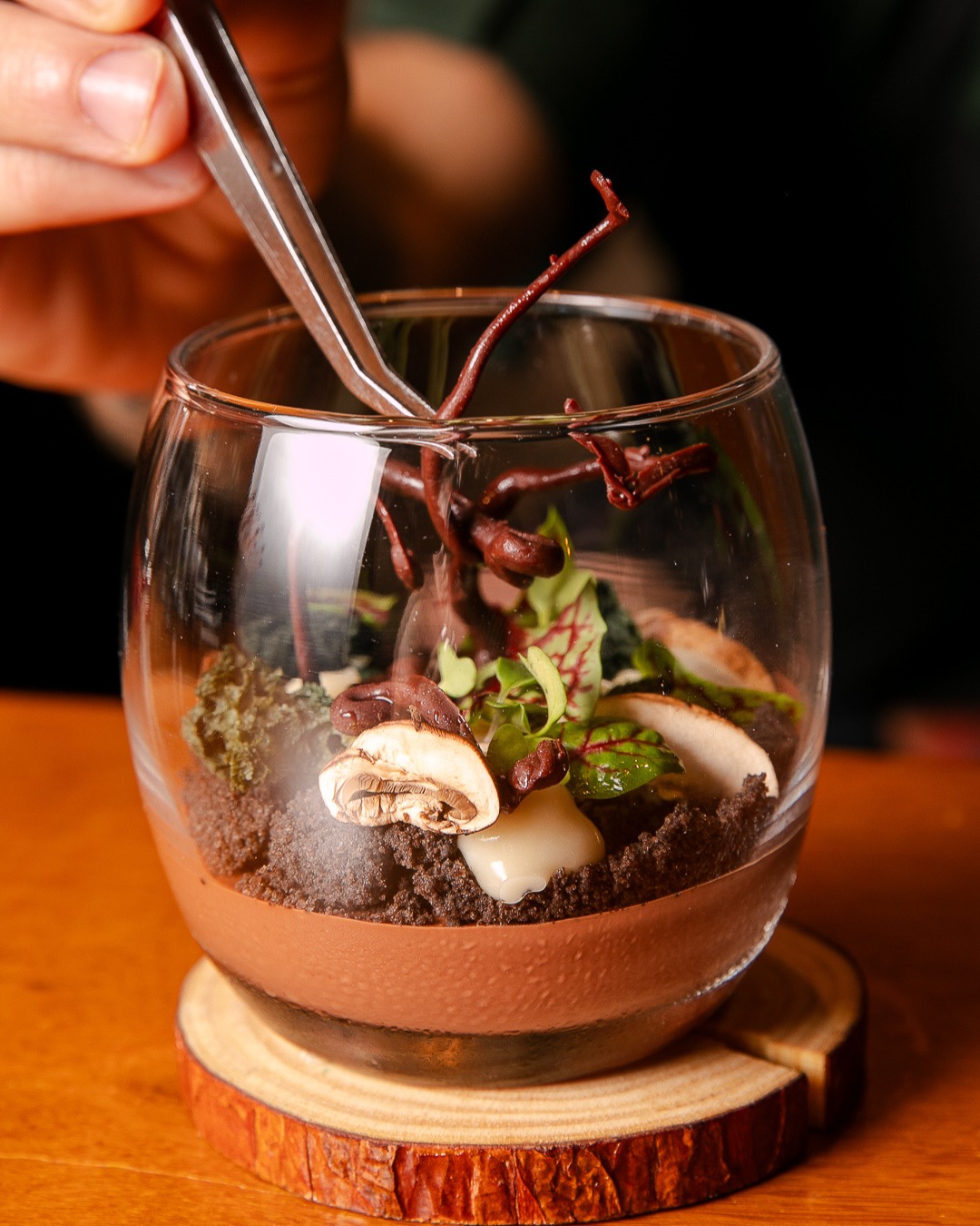 Servido em um delicado copo de vidro, ele recria a estética de um pequeno jardim, trazendo uma experiência que vai além do paladar. A base de terra de cacau black se mistura ao ganache de chocolate com sálvia, criando um perfil intenso e aromático. Para completar, cogumelos portobello e ramos de chocolate 70% entram em cena, surpreendendo com texturas e contrastes que tornam cada colherada única e memorável.