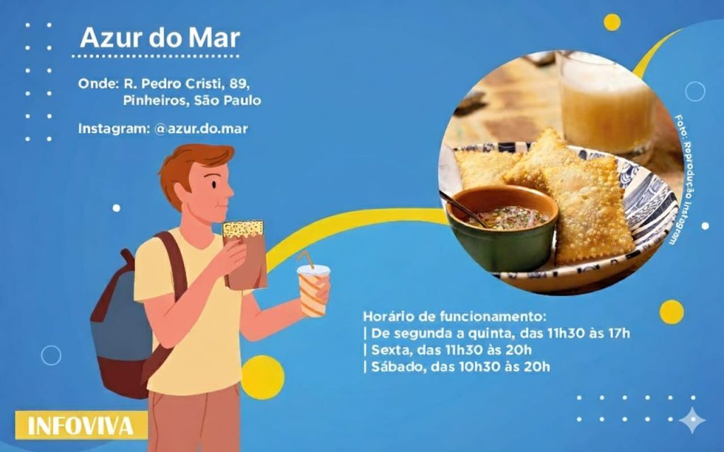 No Mercado Municipal de Pinheiros, o restaurante Azur do Mar se destaca por um cardápio voltado exclusivamente aos sabores do oceano, sempre com porções fartas e ingredientes frescos. Entre as pedidas para começar a refeição, uma boa escolha é o Pastel de Marisco. Servido em três unidades, ele traz um recheio suculento de mexilhão e vôngole, acompanhado de um vinagrete de coentro que realça ainda mais o sabor dos frutos do mar.