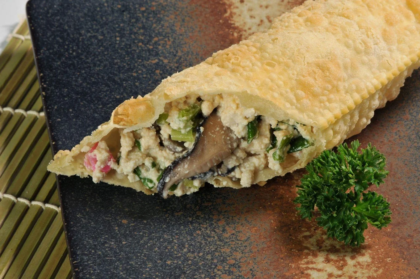 Com um formato mais comprido e estreito do que o habitual, esse pastel já chama a atenção pelo visual, mas é no primeiro mordida que revela sua verdadeira surpresa. Uma combinação sutil entre o clássico pastel brasileiro e os sabores refinados da cozinha japonesa, o quitute é recheado com tofu, kamaboko (massa de peixe curada), cogumelos shitake e cebolinha fresca.