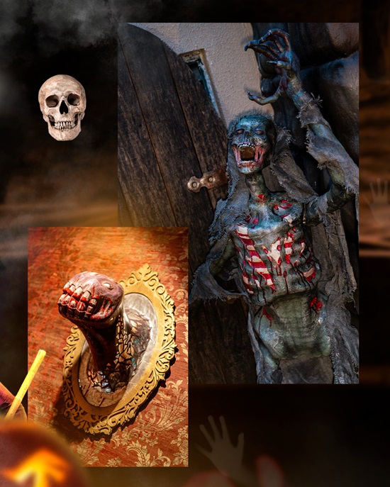 O espaço mistura decoração macabra, personagens monstruosos e efeitos especiais que transformam o jantar em um espetáculo.