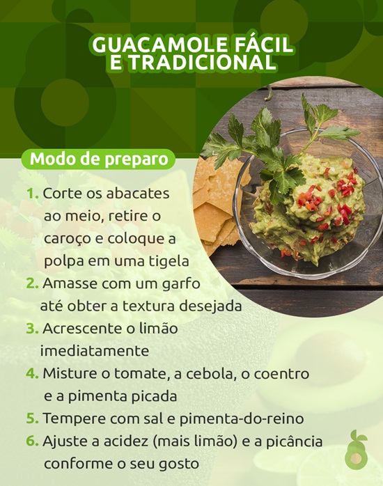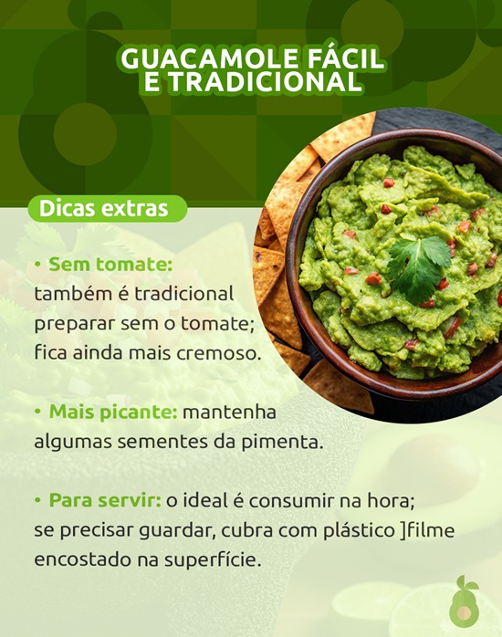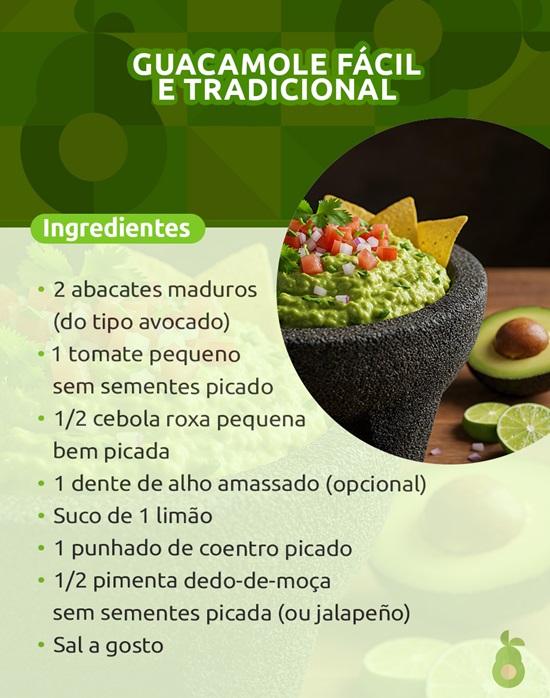 A guacamole é um dos preparos mais versáteis e tradicionais da culinária mexicana — fresca, leve e perfeita para acompanhar tacos, nachos, saladas ou até servir como cobertura de pratos do dia a dia.