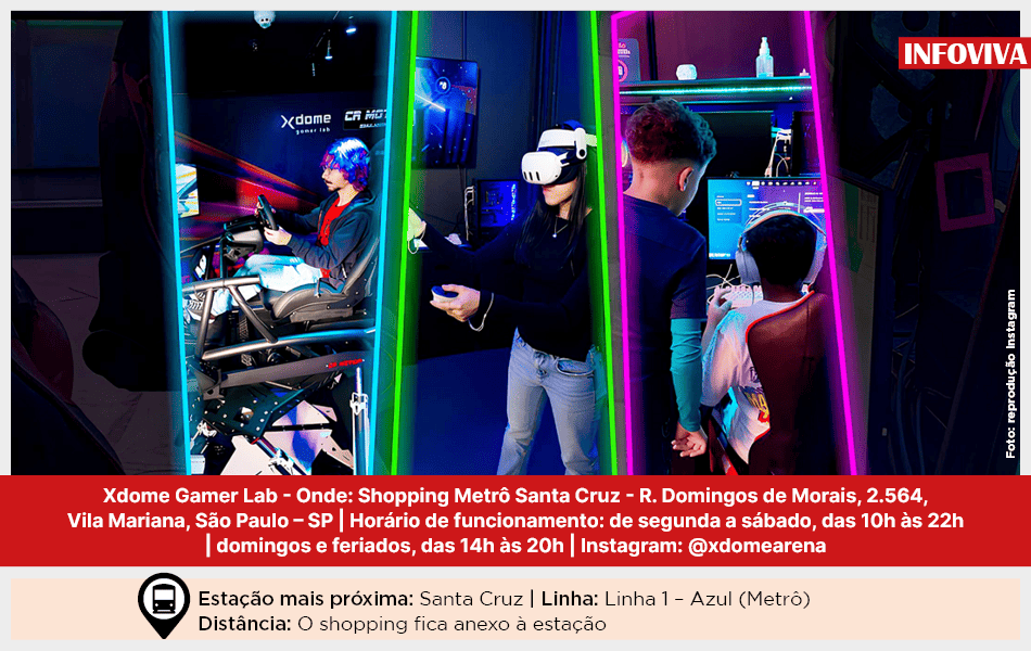 Dentro do Shopping Metrô Santa Cruz, na Vila Mariana, o Xdome Gamer Lab oferece uma experiência high-tech voltada para quem quer mergulhar fundo na realidade virtual. O espaço é conhecido pelo seu clima futurista, com ambientes que simulam um verdadeiro laboratório de jogos.