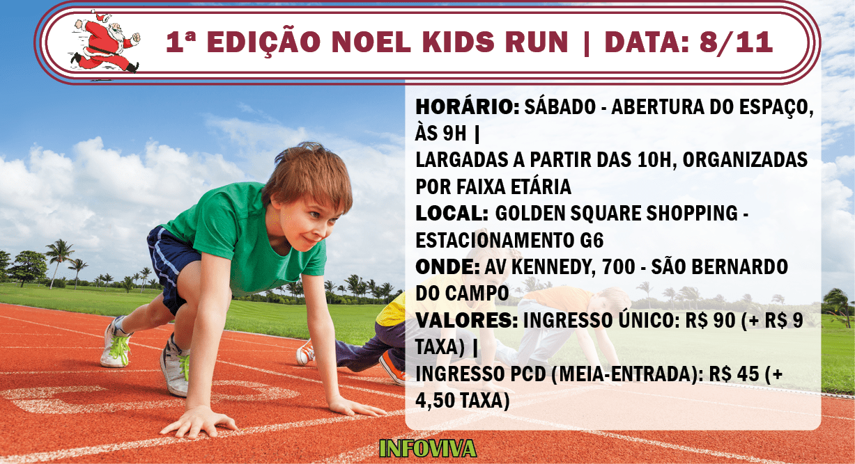 A Noel Kids Run é uma corrida exclusiva para crianças de 4 a 12 anos, criada para incentivar a prática esportiva de maneira lúdica e divertida. O evento acontecerá no estacionamento G6 do Golden Square Shopping, em São Bernardo do Campo. Haverá também brinquedos infláveis, música e animadores, personagens temáticos e a chegada do Papai Noel. Inscrições aqui
