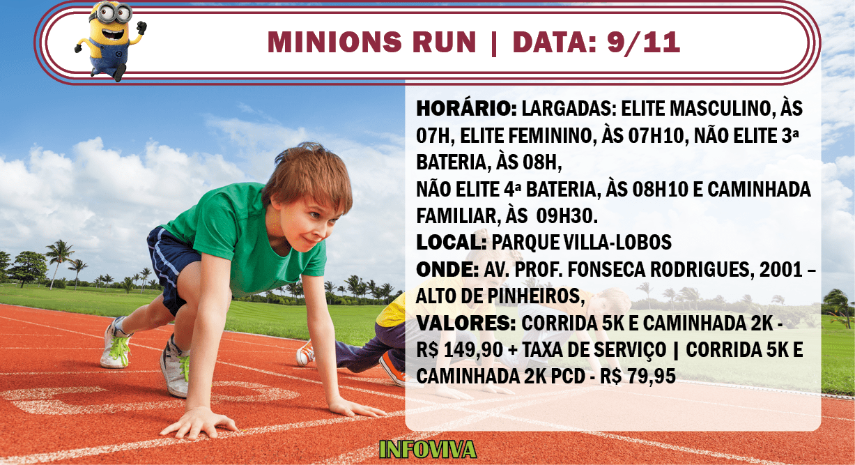 Com percursos de corrida e caminhada, a corrida Minions Run é um evento cheio de alegria para crianças, jovens e adultos que acontece no Parque Villa-Lobos. O evento conta com uma corrida de 5 km, para maiores de 14 anos e uma caminhada livre para todas as idades. Os participantes também poderão escolher ainda entre cinco tipos de kits personalizados com os personagens Kevin, Bob, Phil ou Stuart. Além disso, cada um receberá uma camiseta do personagem escolhido, sacola exclusiva, medalha e número de participação. No Minion’s Squad o participante poderá montar sua própria missão, escolhendo quais Minions o acompanharão na aventura. Inscrições aqui