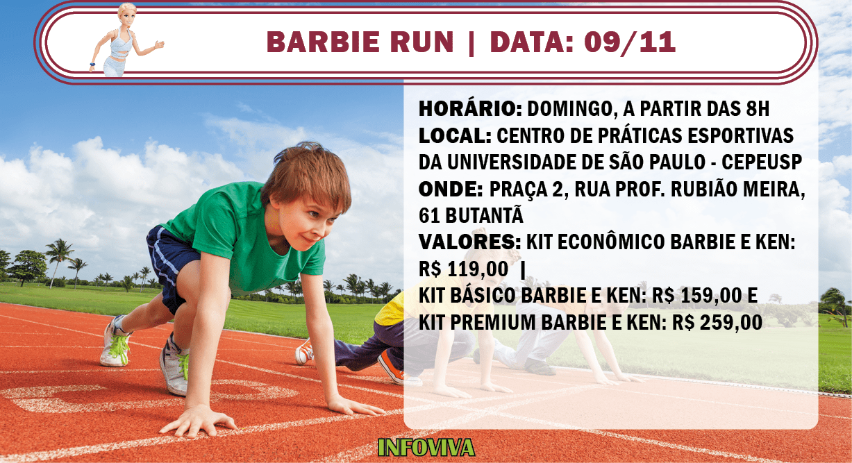 O campus da Universidade de São Paulo (USP) receberá a segunda edição da corrida Barbie Run em novembro. Realizado pela Mattel e Vega Sports, a corrida é destinada a crianças e oferece uma uma experiência cheia de diversão, com classificação etária livre. A prova tem duas opções de distância: uma caminhada de 3 Km e uma corrida de 6 Km. Inscrições aqui.