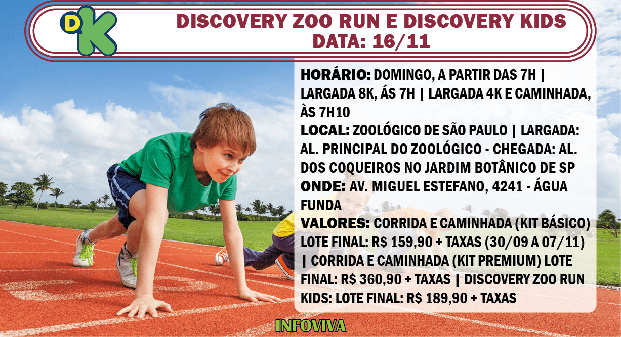 A corrida acontece no Zoológico de São Paulo e as provas para adultos incluem percursos de 4 km e 8 km. Crianças de 4 a 14 anos participam da versão infantil, chamada de Discovery Kids, com baterias de 50 a 1.000 metros. O evento acontece em um local repleto de cenários diferentes, já que, além da corrida, o percurso que une o Zoológico e o Jardim Botânico conta com muitos espaços de interação com a natureza. Inscrições aqui.