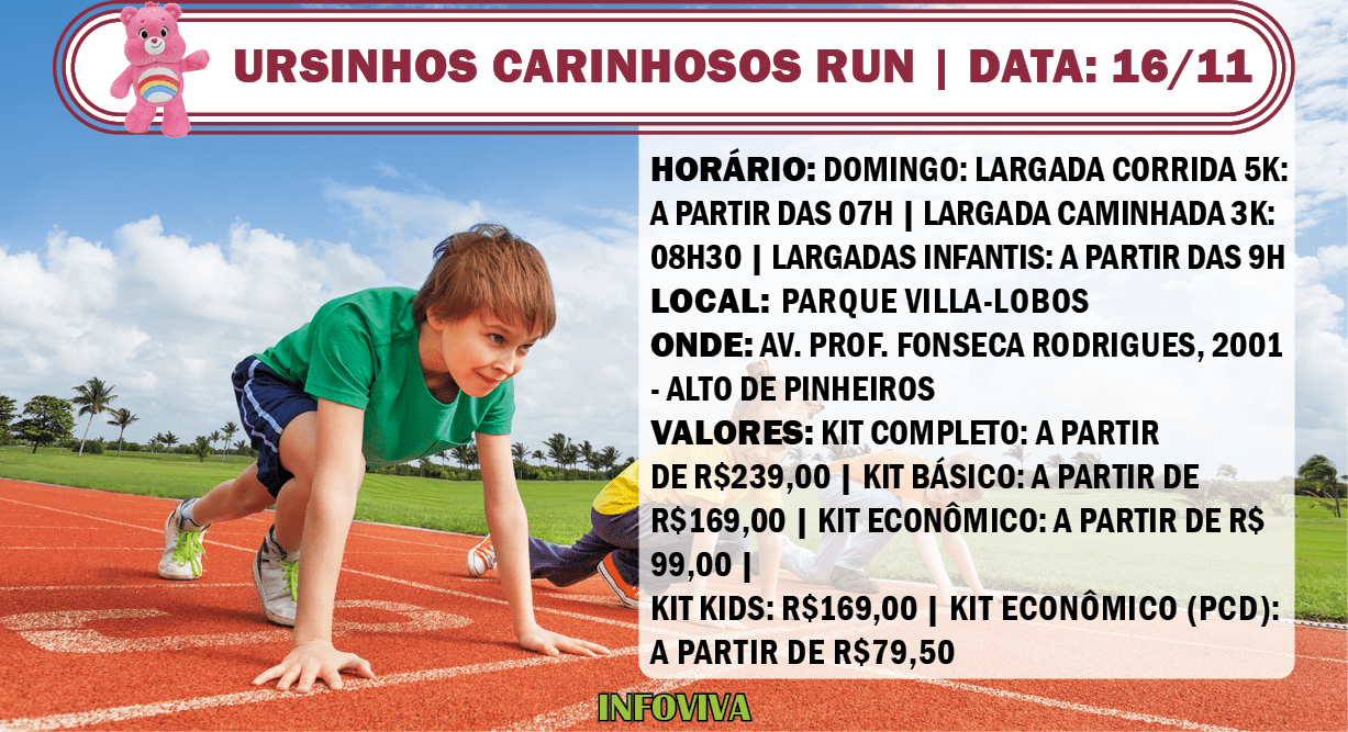 Inspirada na franquia dos Ursinhos Carinhosos, a corrida trará ao Parque Villa-Lobos um evento que propõe alegria, interação e atividade física para todas s idades. Seus percursos são adaptados para todas as idades e serão de 5 Km para adultos, e 3Km de caminhada sem pressa. Para as crianças, os percursos serão de 100m (2 a 3 anos), 200m (4 a 5 anos), 400m (6 a 9 anos) e 600m (10 a 12 anos). Os kits são divididos em quatro tipos: o econômico, que inclui número de peito, medalha e tatuagem; e o kit completo, com camiseta, sacochila, viseira e copo exclusivo do evento. Inscrições aqui.