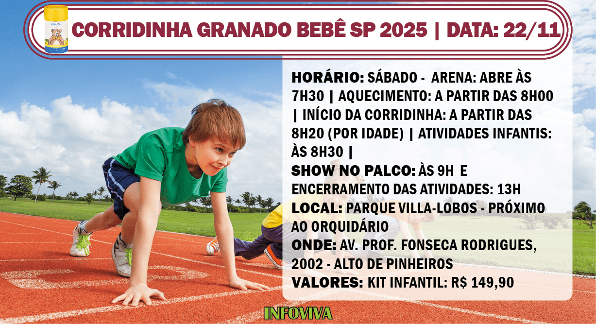 A Corridinha Granado Bebê, acontecerá no Parque Villa-Lobos e promete uma manhã repleta de esporte, música, brincadeiras e muita alegria para crianças e adultos se divertirem juntos. O evento contará com corridas infantis de 50 m a 400 m, shows, brincadeiras, brindes e food trucks. As categorias e distâncias são as seguintes: até 2 anos: 50m (acompanhante obrigatório); 3 a 4 anos: 100m (acompanhante obrigatório); 5 a 6 anos: 200m (acompanhante opcional); 7 a 8 anos: 300m (acompanhante opcional); 9 a 10 anos: 400m (acompanhante opcional). Inscrições aqui.