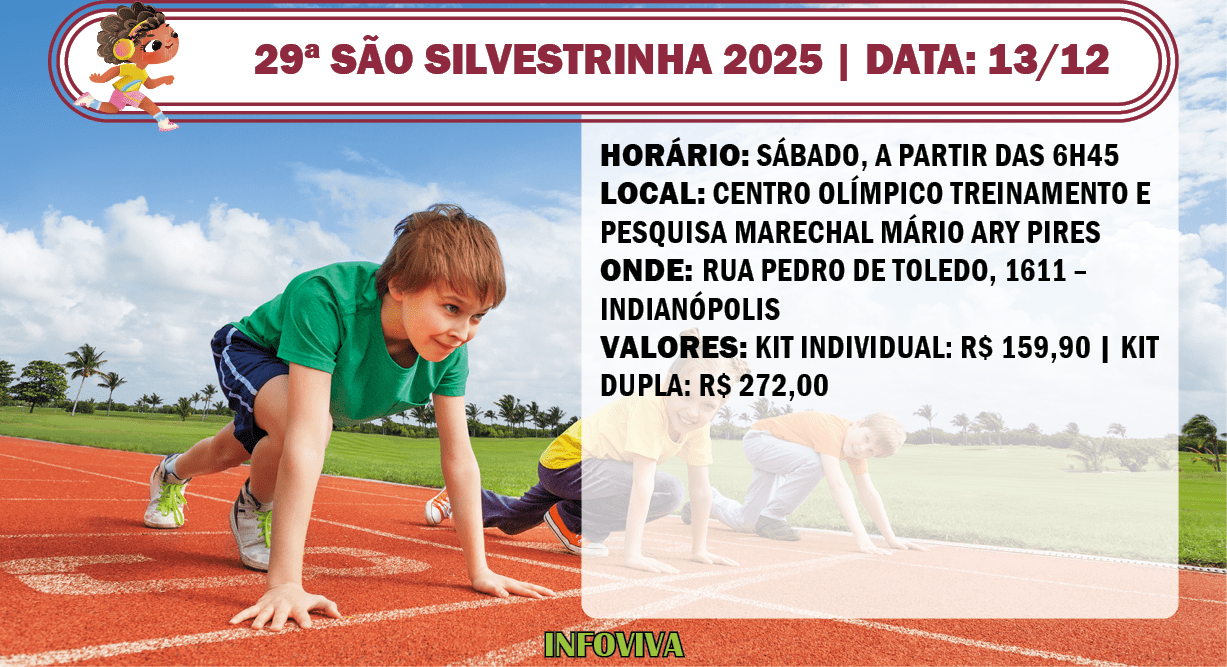 A 29ª edição da São Silvestrinha, marcada para 13 de dezembro, será realizada na pista de atletismo do Centro Olímpico do Ibirapuera. O evento, é voltado para crianças e adolescentes de 4 a 17 anos completos, divididos por faixa etária, que podem participar individualmente ou em dupla. A corrida individual terá os seguintes percursos: 100 m (nascidos entre 2019 e 2021); 200 m (nascidos entre 2015 e 2018); 300 m (nascidos entre 2012 e 2014); 600 m (nascidos entre 2009 e 2011) e 800 m (nascidos em 2008). Já a corrida em dupla (criança + acompanhante) terá os percursos de 100 m (nascidos entre 2019 e 2021) e 200 m (nascidos entre 2015 e 2018). A São Silvestrinha é a versão infantojuvenil da Corrida Internacional de São Silvestre e também integra as celebrações das 100 edições da prova. Inscriçõe aqui.