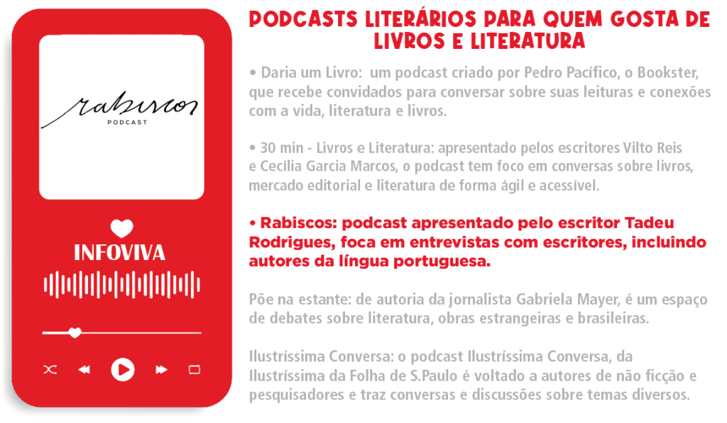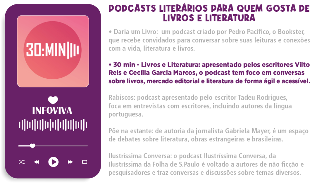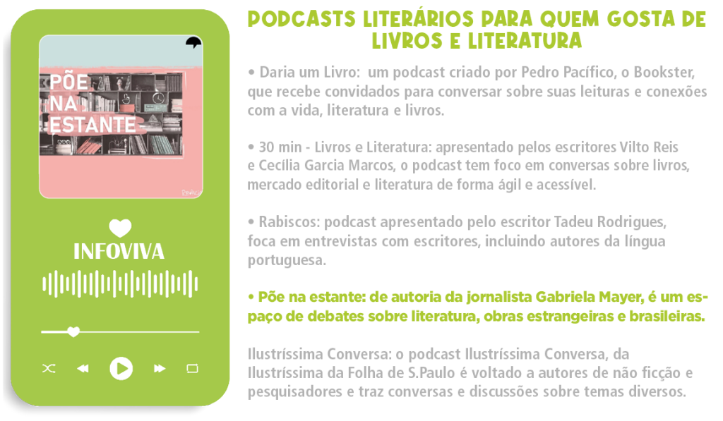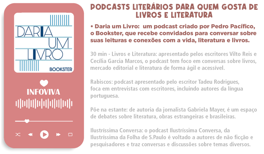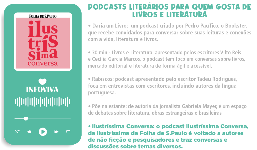 Já os podcasts literários se consolidaram como um espaço de conversa sobre livros. Em um formato leve e acessível, eles apresentam autores, discutem temas ligados à literatura e sugerem novas leituras, ajudando a despertar o interesse de quem ainda está descobrindo esse universo.