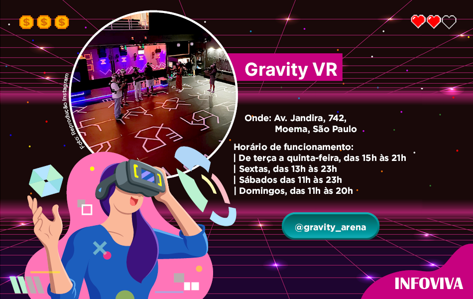 A Gravity VR, em Moema, oferece uma das experiências de realidade virtual mais completas da América Latina. A arena utiliza tecnologia de ponta com sensores de movimento em tempo real, além de equipamentos de última geração que permitem movimentação livre numa área de 100m², sem restrições de fios ou colunas.