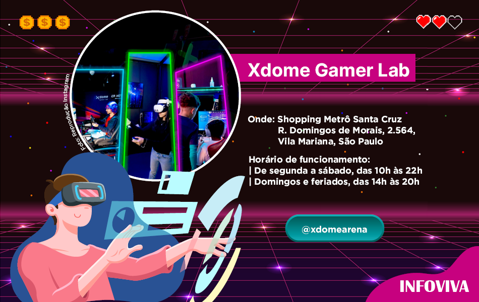 Dentro do Shopping Metrô Santa Cruz, na Vila Mariana, o Xdome Gamer Lab oferece uma experiência high-tech voltada para quem quer mergulhar fundo na realidade virtual. O espaço é conhecido pelo seu clima futurista, com ambientes que simulam um verdadeiro laboratório de jogos.