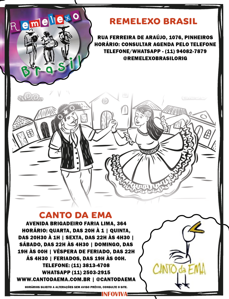 Fundado em 2000, o Canto da Ema é uma casa de forró e bar com características nordestinas, onde é possível comer, dançar, ouvir música ou apenas aproveitar o ambiente. Localizado na Faria Lima, o espaço tem uma decoração rústica e bem cuidada, além de diversas opções de comidas e bebidas para quem gosta de curtir um pouco da cultura nordestina na cidade de São Paulo. No lugar é possível fazer aulas de forró, que acontecem às quintas, sextas, sábados e domingos antes do forró.