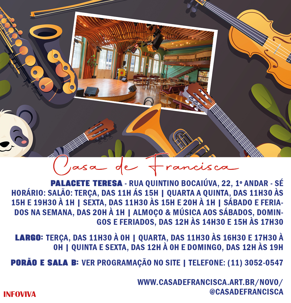 Local conhecido por sua diversidade de público, a Casa Francisca é uma opção para quem gosta de curtir boa música em um espaço com bar e restaurante. Localizada no Palacete Teresa, um patrimônio histórico que já foi conhecido como “a esquina musical de São Paulo”, a casa oferece música ao vivo que vai do samba, MPB, forró, pagode, entre outros, apresentados por artistas consagrados e também novas vozes. As apresentações ocorrem em diferentes espaços da casa, como o salão principal, o porão, e também no Largo em frente ao Palacete.