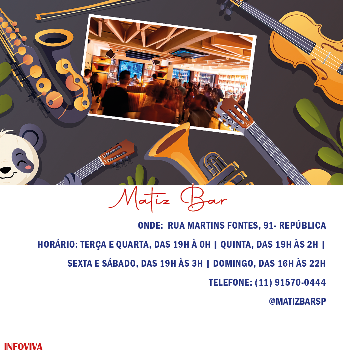 O Matiz Bar conta com uma a programação musical variada que foca em estilos de música eletrônica, jazz, soul, funk, disco e música brasileira. Localizado no centro da cidade, o bar também organiza eventos temáticos e festas especiais. Além disso, o espaço sofisticado e descolado conquista por sua coquetelaria autoral, uma gastronomia elaborada e um terraço com uma vista privilegiada do centro da cidade.