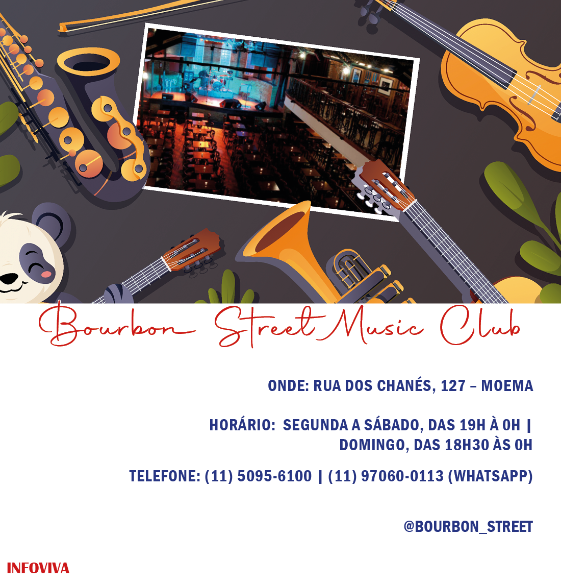 Considerado um dos melhores clubes de Jazz e Blues do Brasil, o Bourbon Street Music Club é uma excelente opção para quem gosta de excelente música ao vivo e gastronomia. Com uma atmosfera que lembra os bares de New Orleans, o espaço conta com uma programação intensa, com boas apresentações nacionais e internacionais é uma referência na cena musical paulistana.