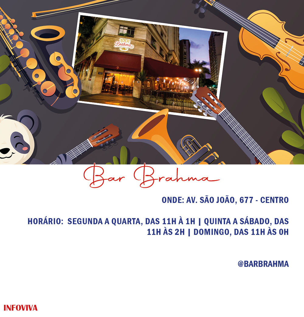 Um dos endereços mais icônicos da boemia paulistana, o Bar Brahma reúne samba, MPB, pagode, soul e forró ao vivo em uma das esquinas mais famosas de São Paulo. Uma das casas mais tradicionais de São Paulo, o espaço é uma excelente opção para quem gosta de diversidade da música brasileira, tributos especiais, projetos e atrações fixas de sucesso e de novos talentos. Com música ao vivo todos os dias, coquetelaria autoral e gastronomia de qualidade, o Bar Brahma possui três ambientes: a Esquina, a Varanda e o Salão Principal, sempre com atrações diversas.