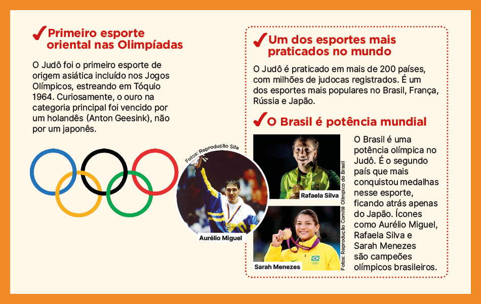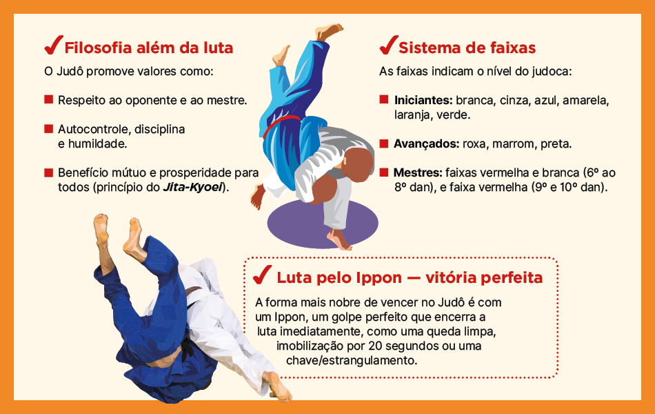 No Brasil, o judô chegou por volta das décadas de 1920 e 1930, trazido por imigrantes japoneses. Desde então, o país se tornou uma potência mundial, acumulando 24 medalhas olímpicas — sendo o esporte que mais deu pódios ao Brasil nos Jogos. Nomes como Aurélio Miguel, Rafaela Silva, Mayra Aguiar e Rogério Sampaio tornaram-se símbolos da força e da tradição brasileira na modalidade.